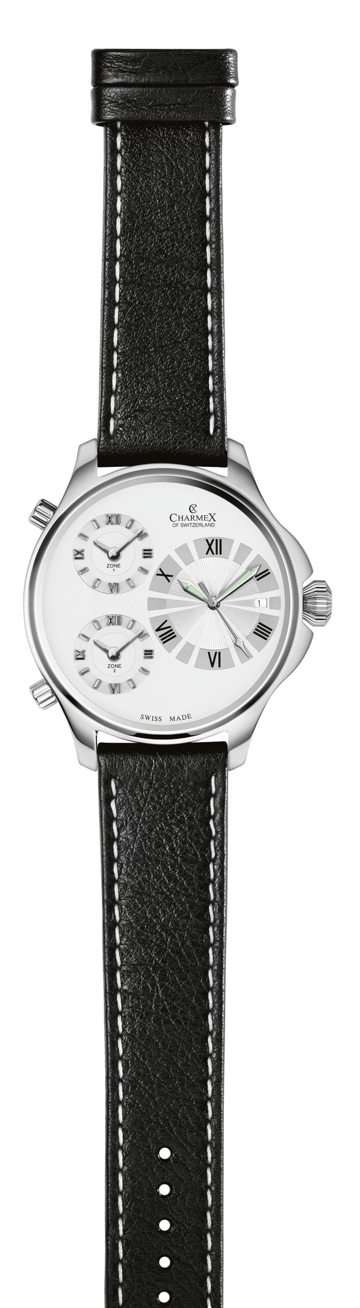 Our model COSMOPOLITAN II is the perfect companion for those travelling often or dealing with clients in different time zones – the main time zone is indicated by the slightly larger dial sporting a date window while the two additional time zones are slightly smaller and without date