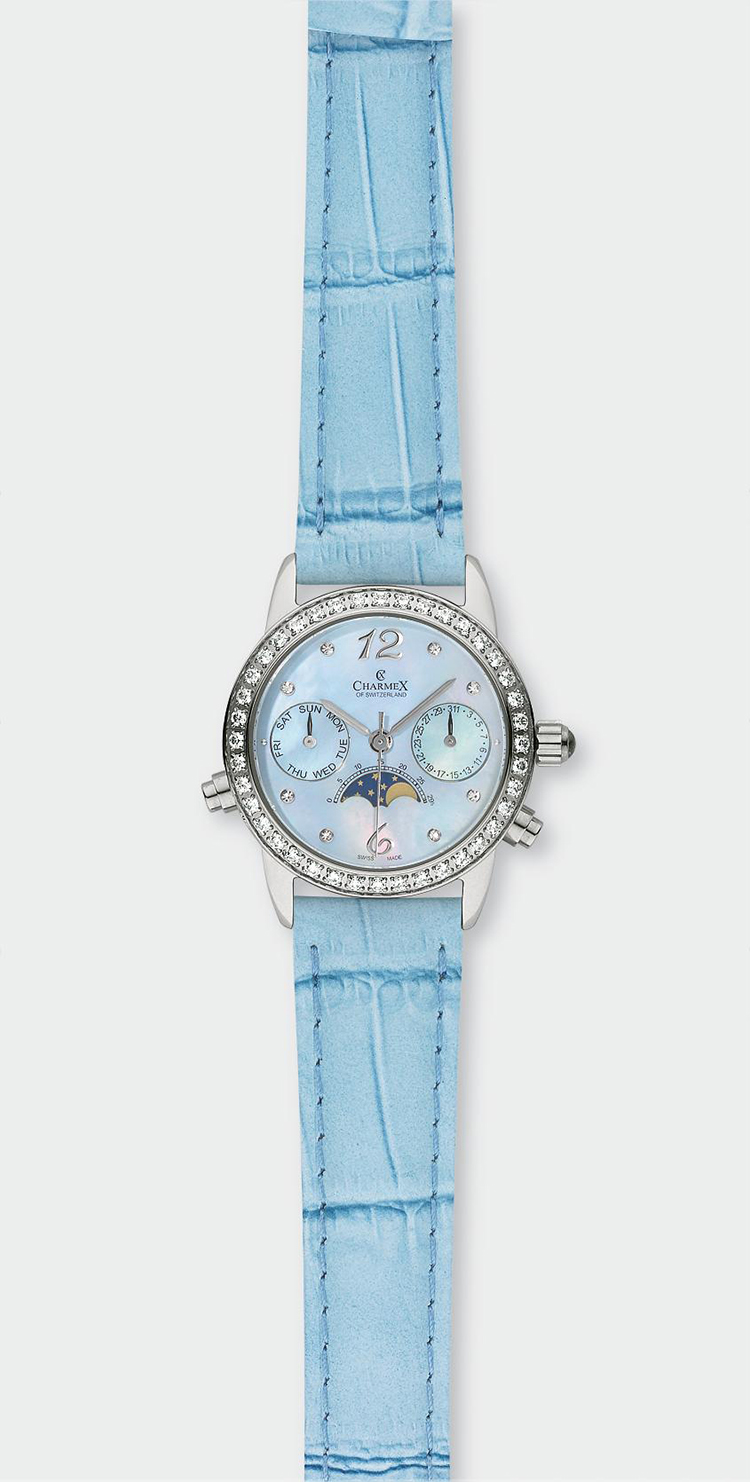 Mandalay, the second biggest city in what today is known as Myanmar, was once the last Burmese Emperors capital. In the 19th century this city’s name was used synonymously for the beguiling and mysterious lure of the Far East. Our timepieces MANDALAY evoke this aura with their exotic and filigree design. The use of the Ronda movement cal. 706 allows for a multi-function display of day, date and moon phase. The mother-of-pearl dial adds to the subtropical flair and is framed by genuine set circonias.